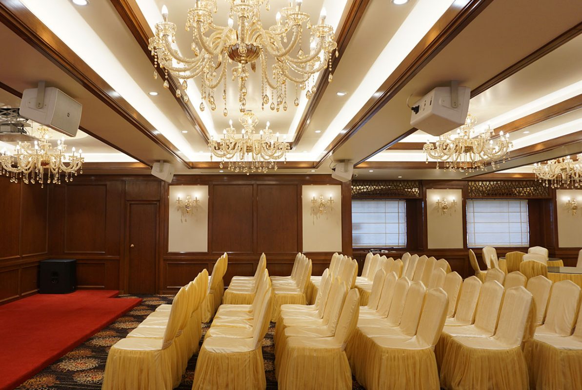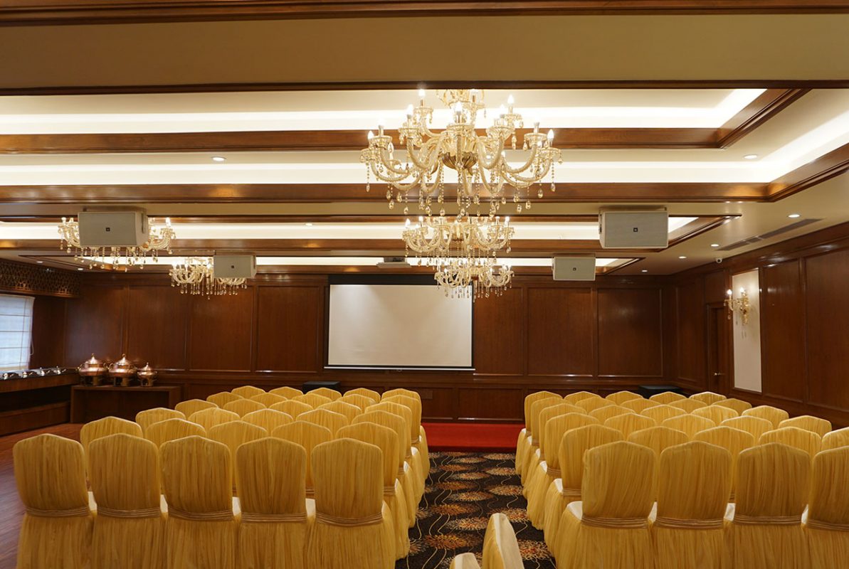 The Banquet hall is designed with luxurious theme in mind which is further enhanced using rich coloured veneer as wall panelling with touch of wood accent to the false ceiling & jaali works and sturdy decorative columns to support them.