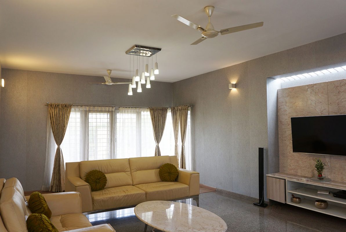The house predominantly is in contemporary style with the pooja room, fine living elements and the wall paintings in the house depicting the vernacular style that’s been interwoven with it.